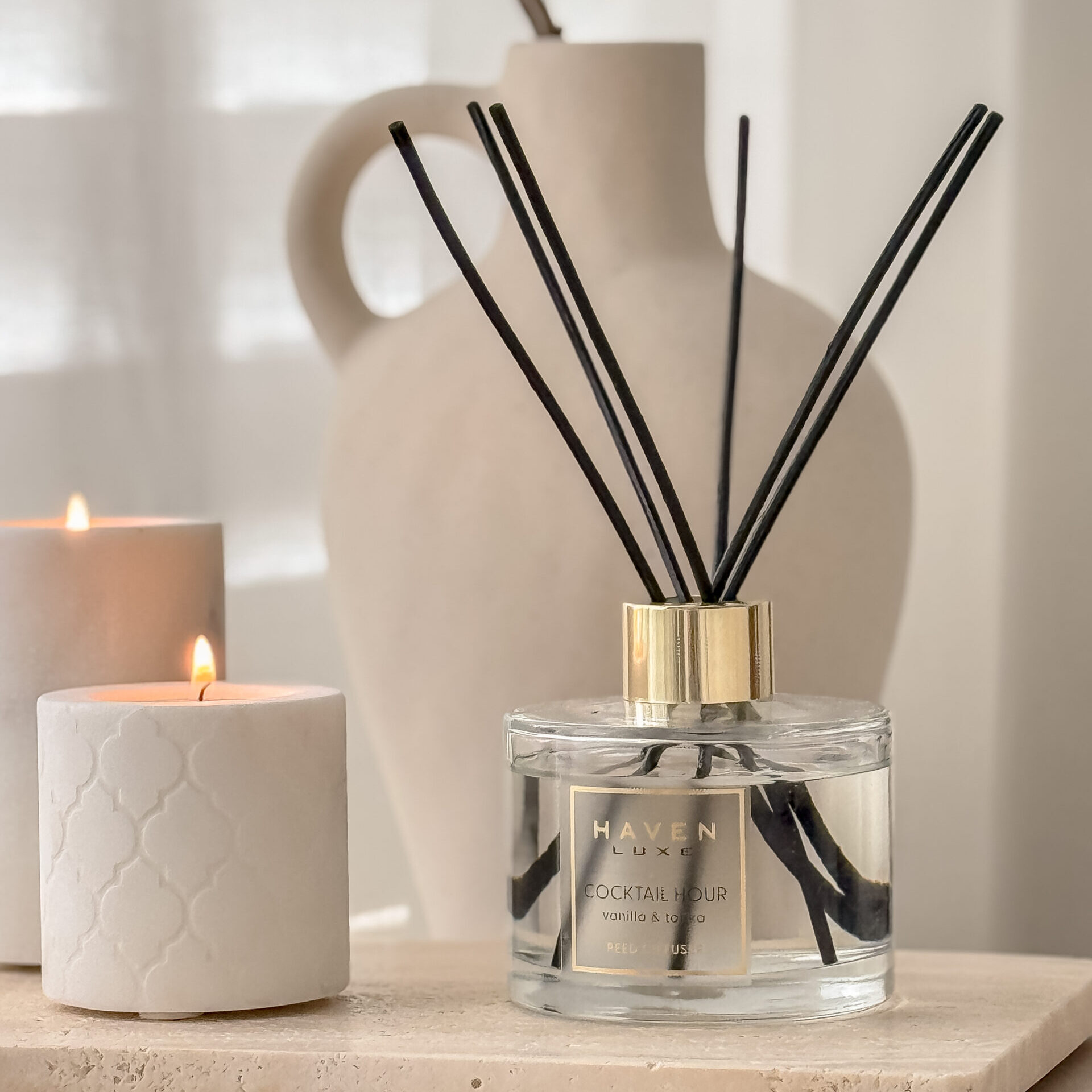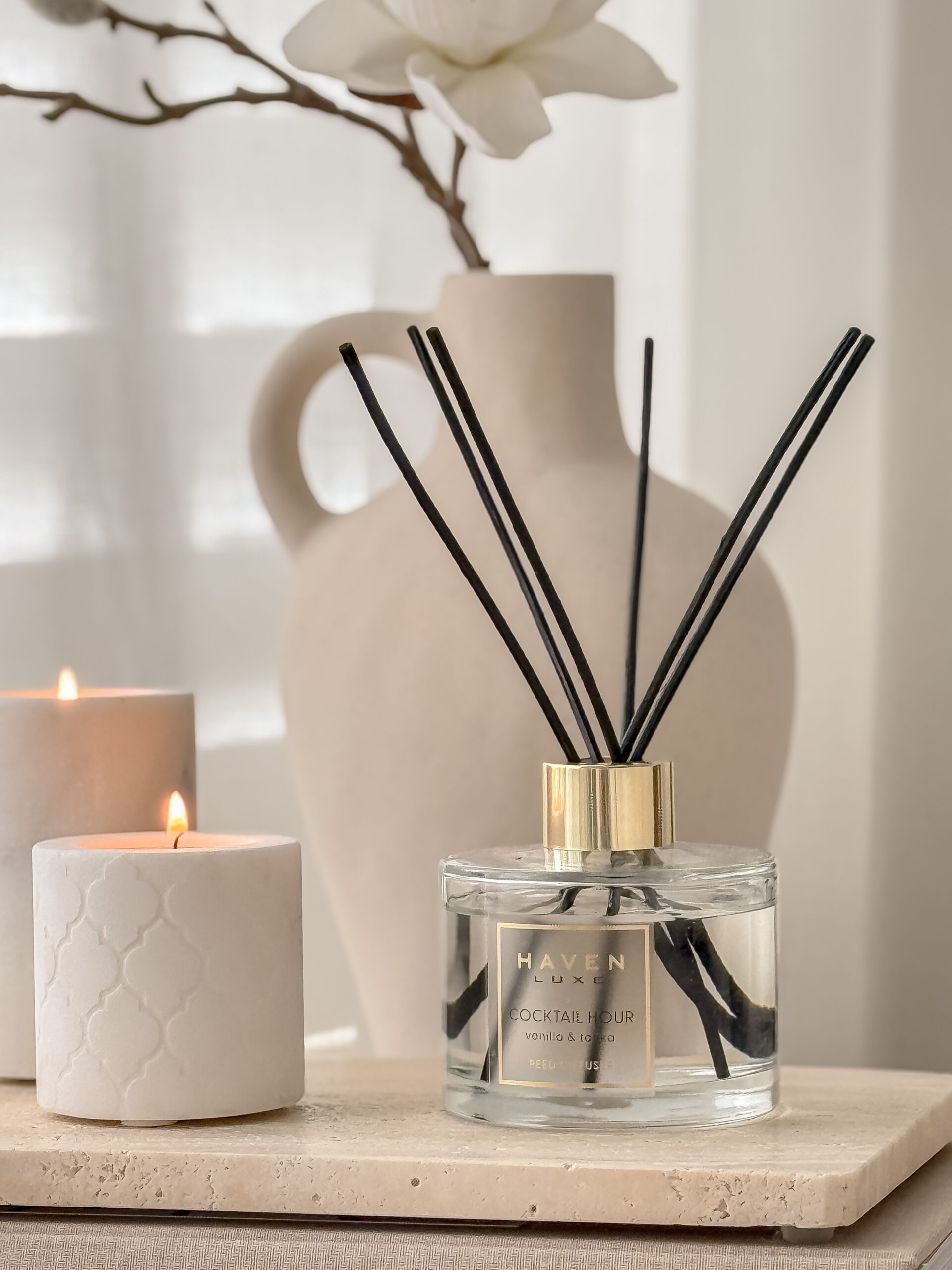 The Haven Luxe Cocktail Hour Reed Diffuser is your invitation to golden sunsets, warm breezes, and sweet summer moments. Inspired by beachside evenings and vibrant cocktails, this diffuser infuses your space with a smooth, uplifting fragrance. No flame, no fuss—just effortless ambience, day or night