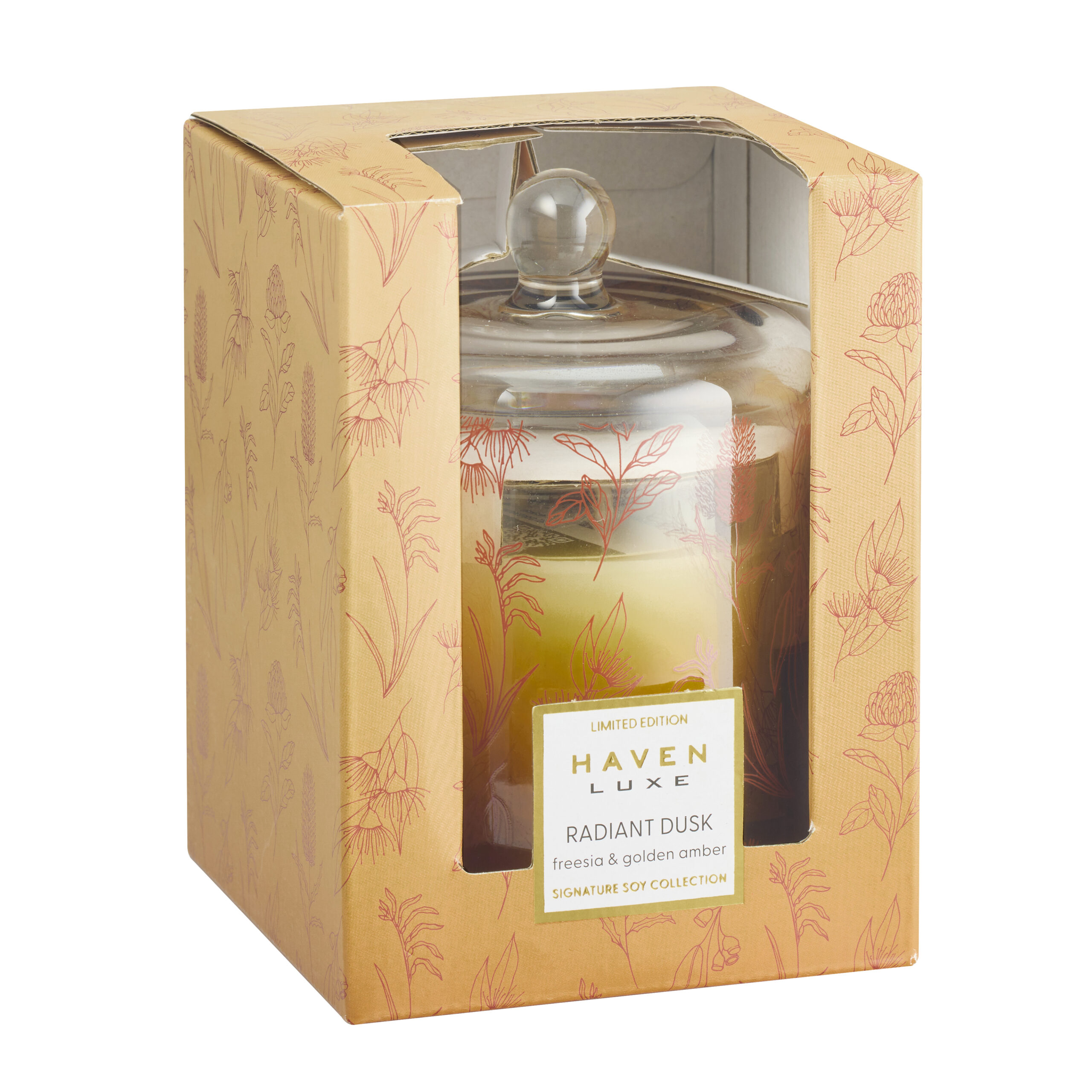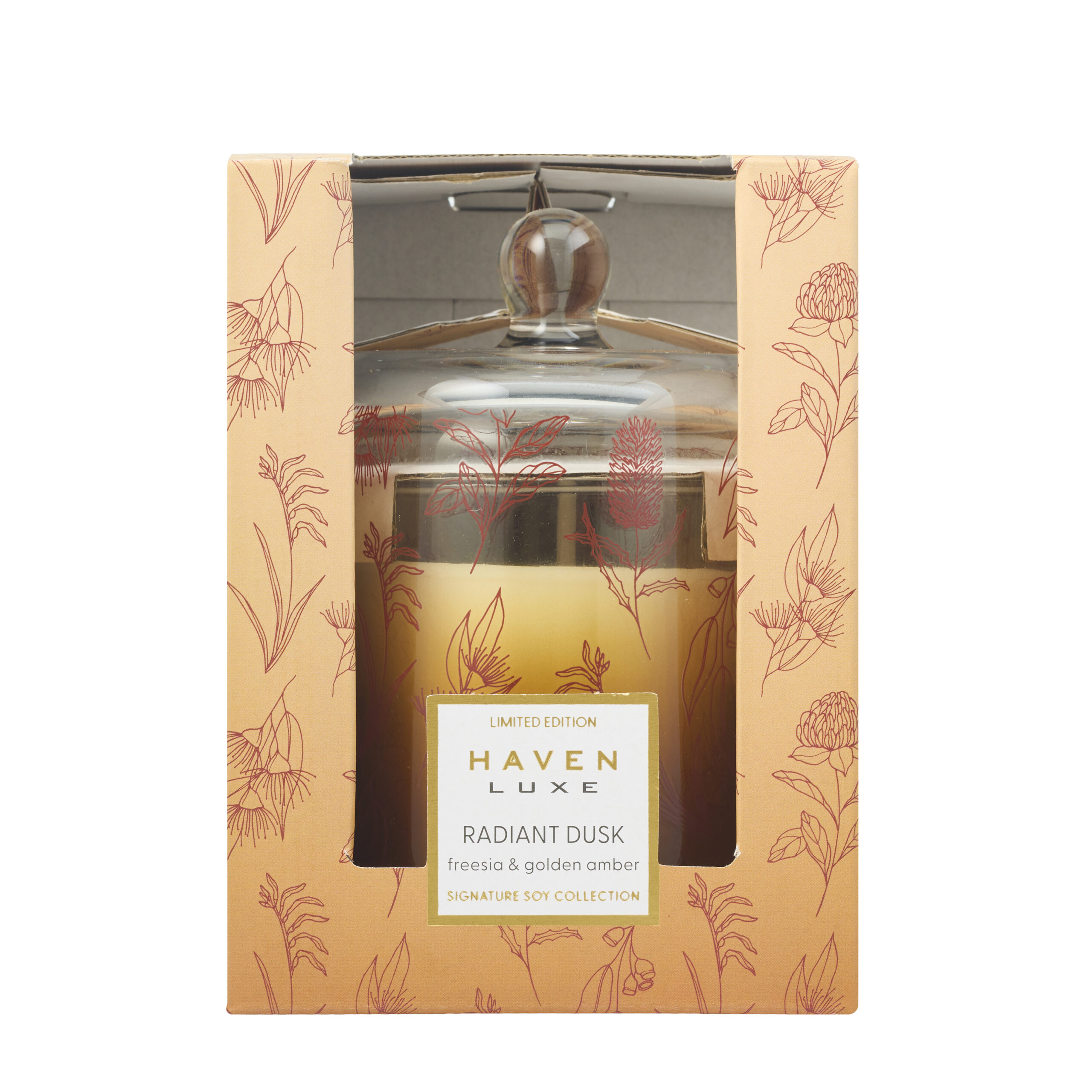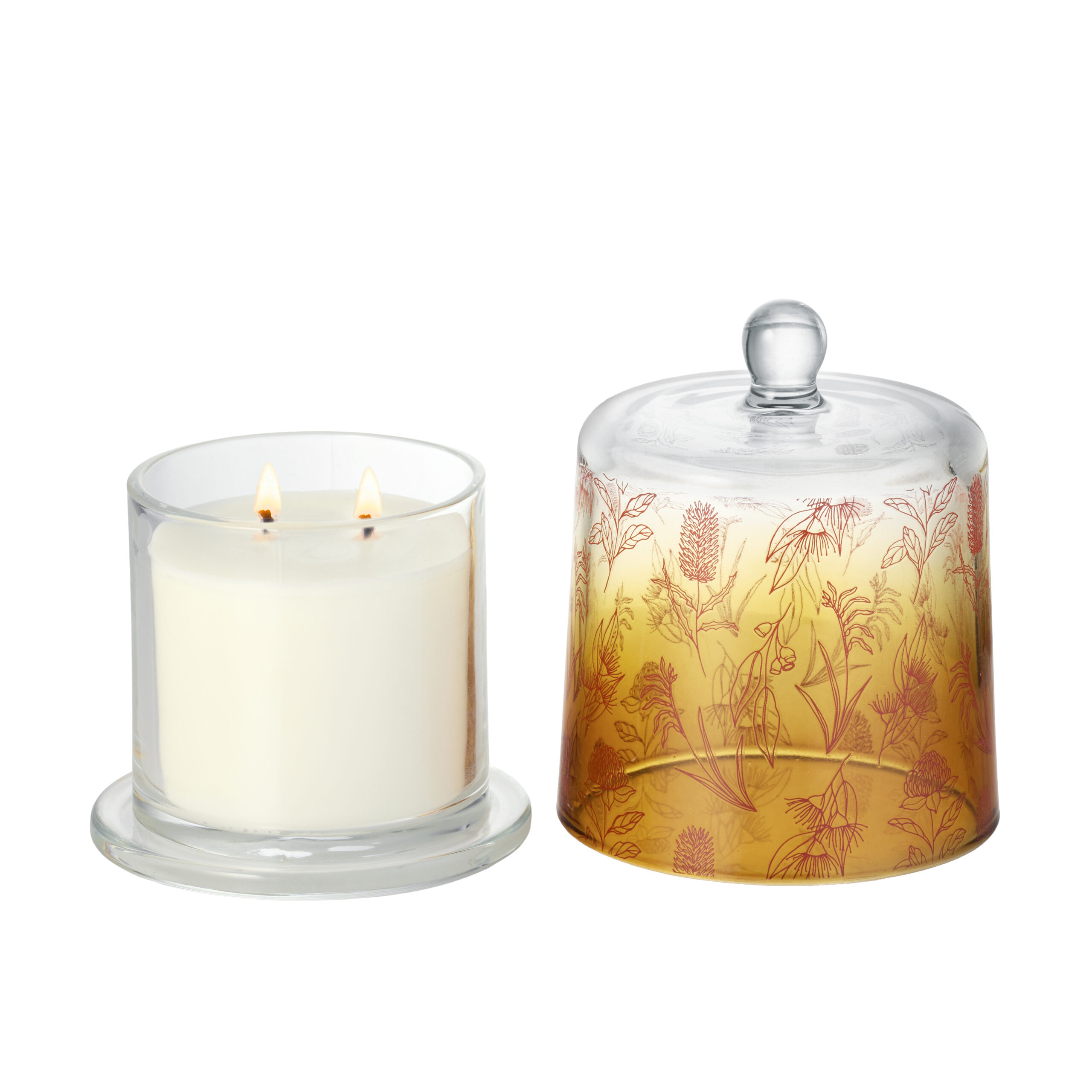 Designed to glow through the winter season, Radiant Dusk brings warmth and elegance to any setting. Encased in a gradient golden glass dome featuring a soft floral decal, this candle is both a decorative piece and a sensory experience. Two wicks provide an even, inviting burn that gently illuminates the space.