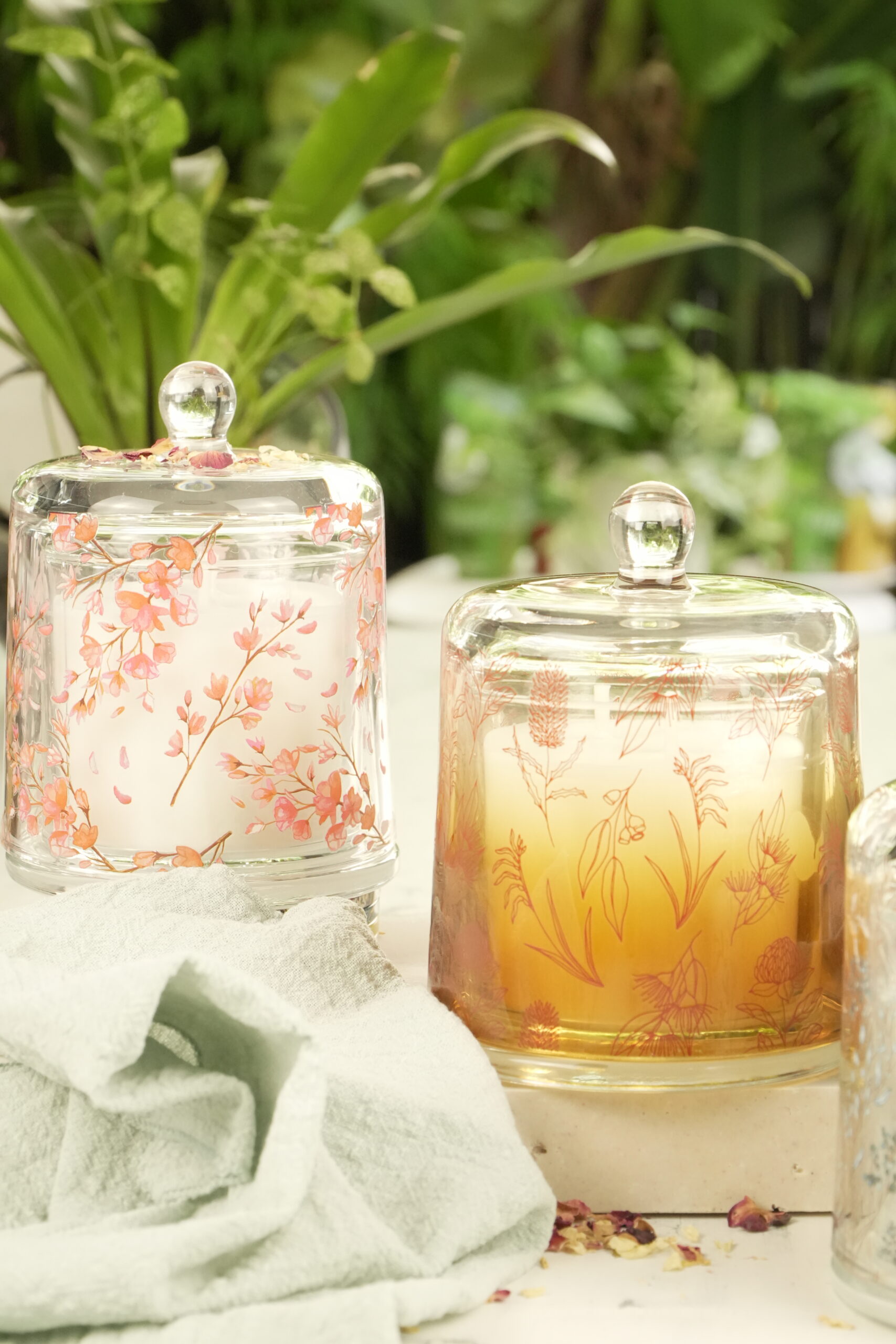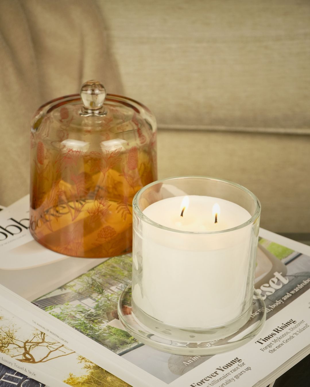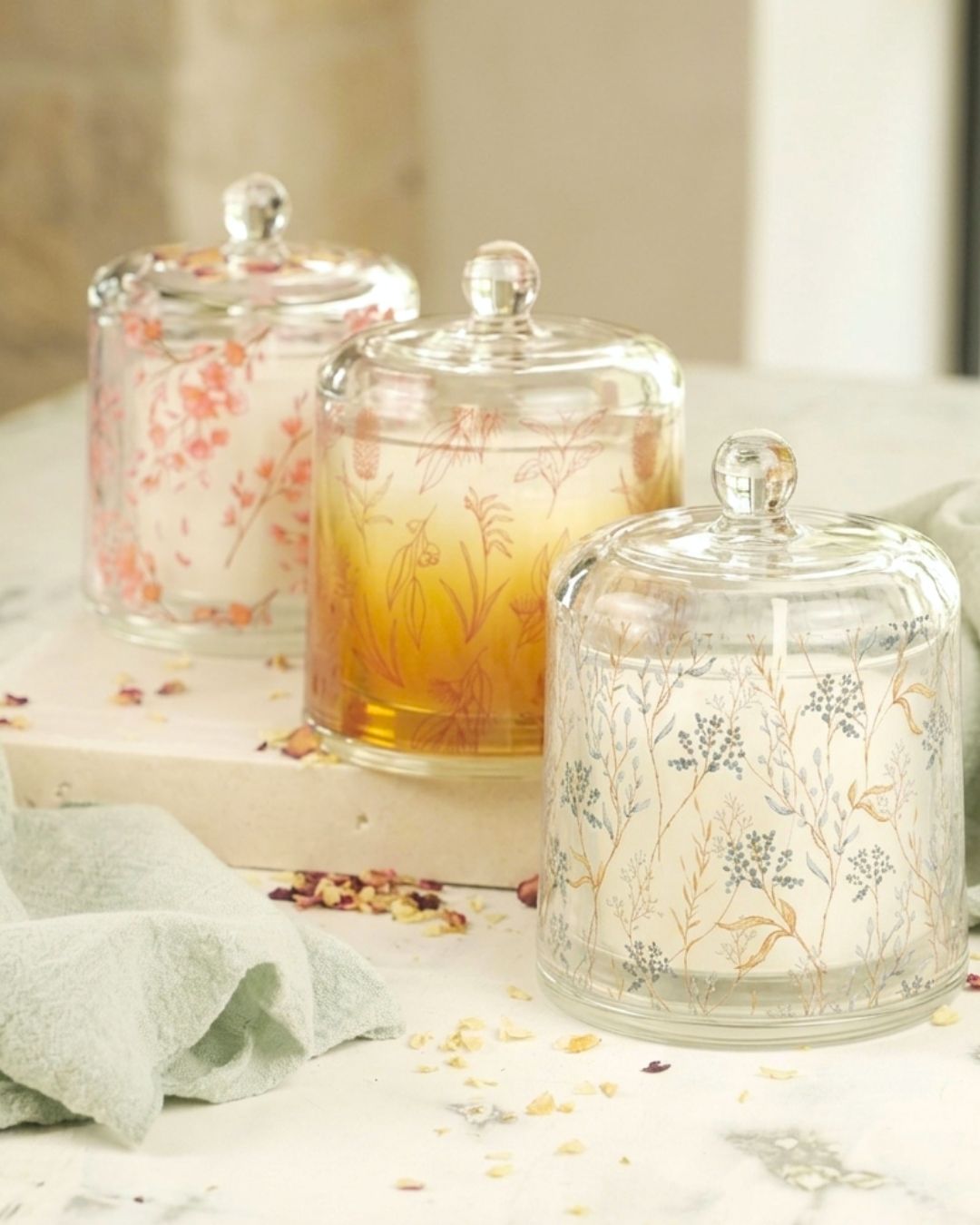 Designed to glow through the winter season, Radiant Dusk brings warmth and elegance to any setting. Encased in a gradient golden glass dome featuring a soft floral decal, this candle is both a decorative piece and a sensory experience. Two wicks provide an even, inviting burn that gently illuminates the space.